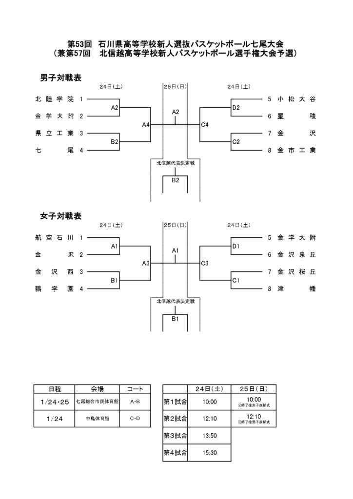 【 石川県 組合せ 高校バスケットボール新人戦】