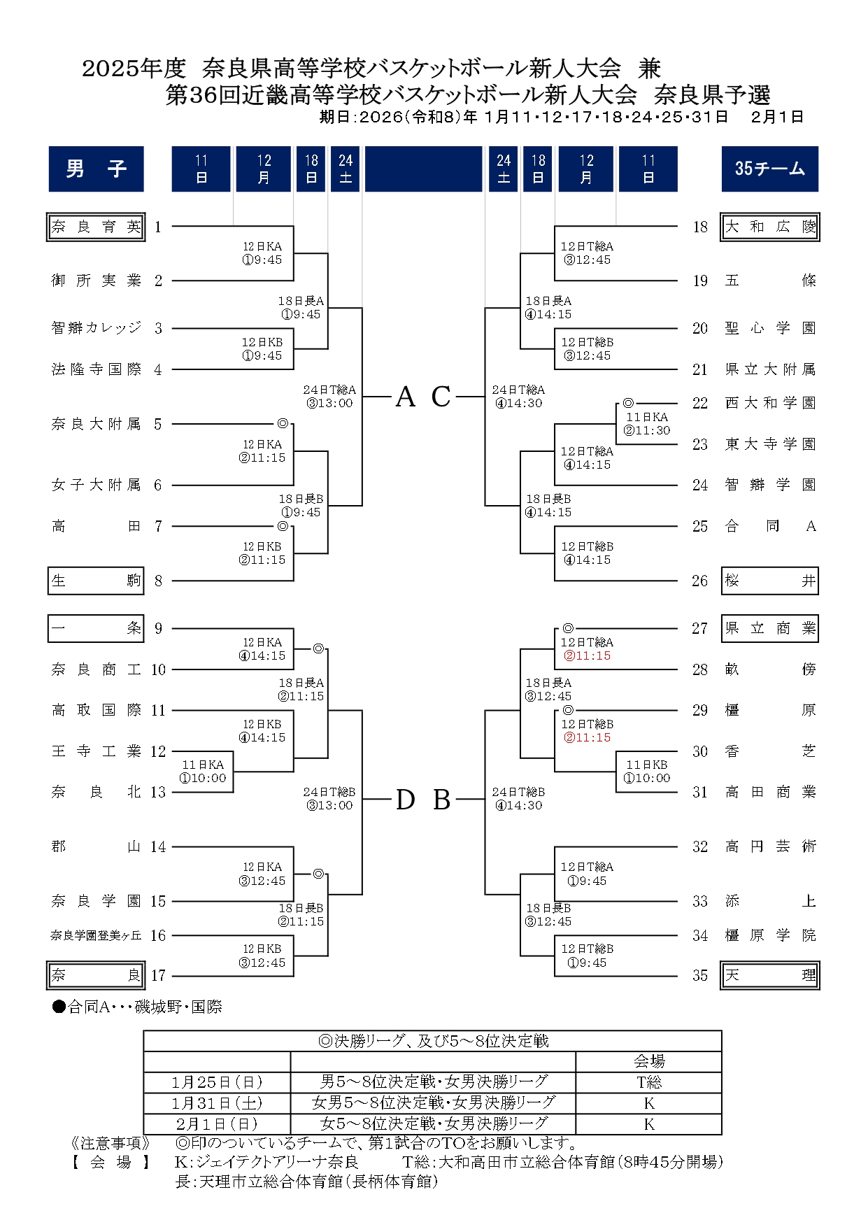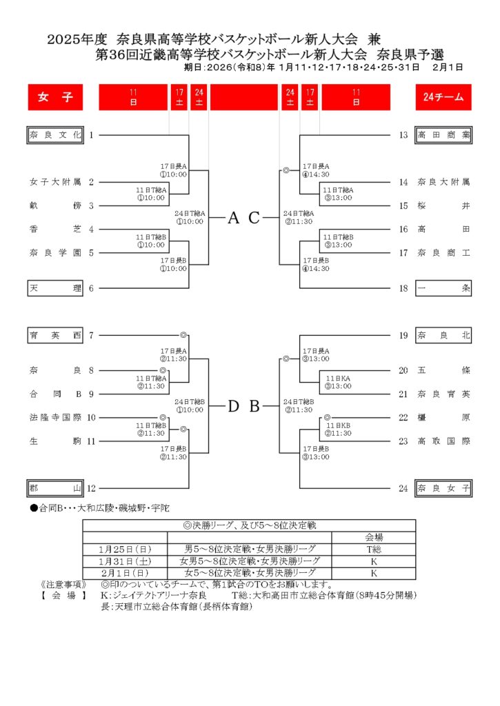 【 奈良県 組合せ 高校バスケットボール新人戦】