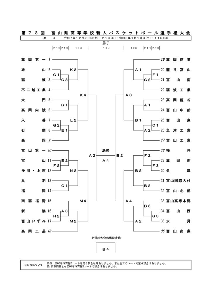 【 富山県 組合せ 高校バスケットボール新人戦 男子】