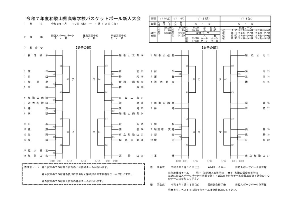 【 和歌山県 組合せ 高校バスケットボール新人戦】